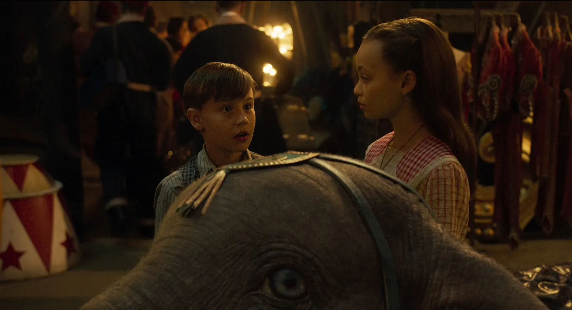 Cast: Colin Farrell as Holt Farrier, Michael Keaton as V. A. Vandemere, Danny DeVito as Max Medici, Eva Green as Colette Marchant, Alan Arkin as J. Griffin Remington, Nico Parker as Milly Farrier, Finley Hobbins as Joe Farrier, Roshan Seth as Pramesh Singh, Deobia Oparei as Rongo the Strongo, Joseph Gatt as Neils Skellig, Miguel Muñoz Segura as Ivan the Wonderful, Sharon Rooney as Miss Atlantis, Zenaida Alcalde as Catherine the Greater, Michael Buffer as Baritone Bates, Phil Zimmerman as Rufus Sorghum, Ragevan Vasan as Pritam Singh, Frank Bourke as Puck the Organ Grinder, Zelda Rosset Colon as Anne Farrier, Benjamin French as Contortionist, Jana Posna as Poodle Trainer, Jo Osmond as Cook, Jewels Good as Mademoiselle Flambé, Lars Eidinger as Hans Brugelbecker, Tom Seekings as Teenager in Crowd, Douglas Reith as Sotheby, Sandy Martin as Verna the Secretary, Heather Rome as Stuffy Society Woman, Scott Haney as Rancher, Erick Hayden as Rancher, Greg Canestrari as Heckler, Chris Rogers as Heckler, Max Gill as Mean Teen, Peter Brookes as Mean Teen, Simon Connolly as Stage Manager, Nick Bartlett as Armored Truck Driver, Harry Taylor as Power Tower Guard, Vincent Andriano as Bridge Guard, Liam Bewley as Nightmare Island Guard, Ben Crowe as Dreamland Guard, Josef Davies as Dreamland Security Guard, Clive Brunt as Burly Engineer, Richard Leeming as Pipsqueak Engineer, Angela Ashton as First Maid, Alice Bonifacio as Second Maid, Philip Rosch as Reporter, Joseph Macnab as Reporters, Rob Heanley as Reporter, Amerjit Deu as Indian Ship Captain, Lucy DeVito as Coat Check Girl, Richard James-Clarke as Joplin Man, Matthew Castle as Joplin Man, Bret Jones as Joplin Man, Zee Asha as Joplin Woman, Carol Been as Joplin Woman, Jessica Barker-Wren as Joplin Woman, Arabella Neale as Woman, Rosie Akerman as Woman, Tim Southgate as Vendor, Anatoli Akerman as Clown, Kamil Lemieszewski as Circus Attendant (uncredited), Zoë Scott as Lavish Apartment Maid (uncredited), Suan-Li Ong as Fringe Girl Dancer (uncredited), Bern Collaço as Joplin Audience Member, Paul Riddell as Circus Goer (uncredited), Will Rowlands as Mr. Wilcox Customer